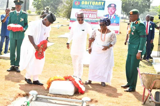 The burial ceremony Firing of the Ceremonial volleys, the Last Post the reading of the Funeral Oretion, Presentation of Flag to diceased next of kin and the laying of wreaths by the National Security Adviser, Mallam Nuhu Ribadu, Chief of Defence Staff, Chief of Army Staff, and Mrs. Dorathy Ali, the deceased’s wife.